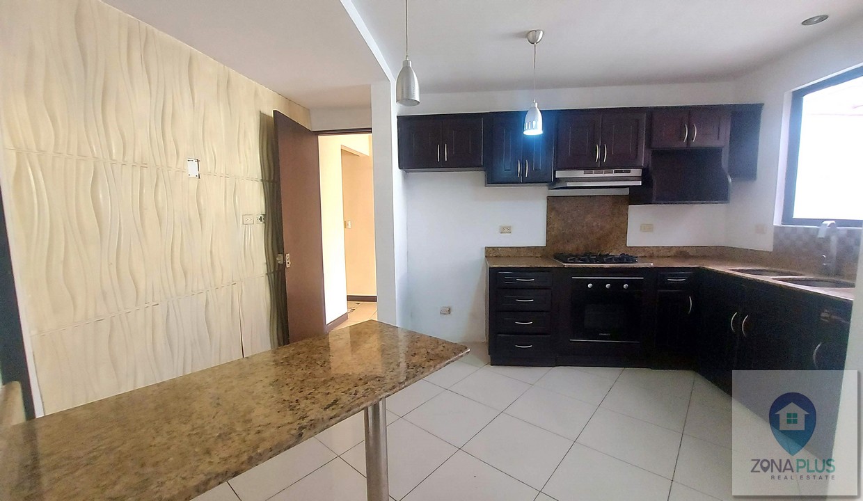 Cocina independiente, diseñada para aquellos que aprecian la separación de espacios funcionales, con muebles aéreos, desayunador con sobre en granito natural, cocina con muebles en madera, horno y extractor.